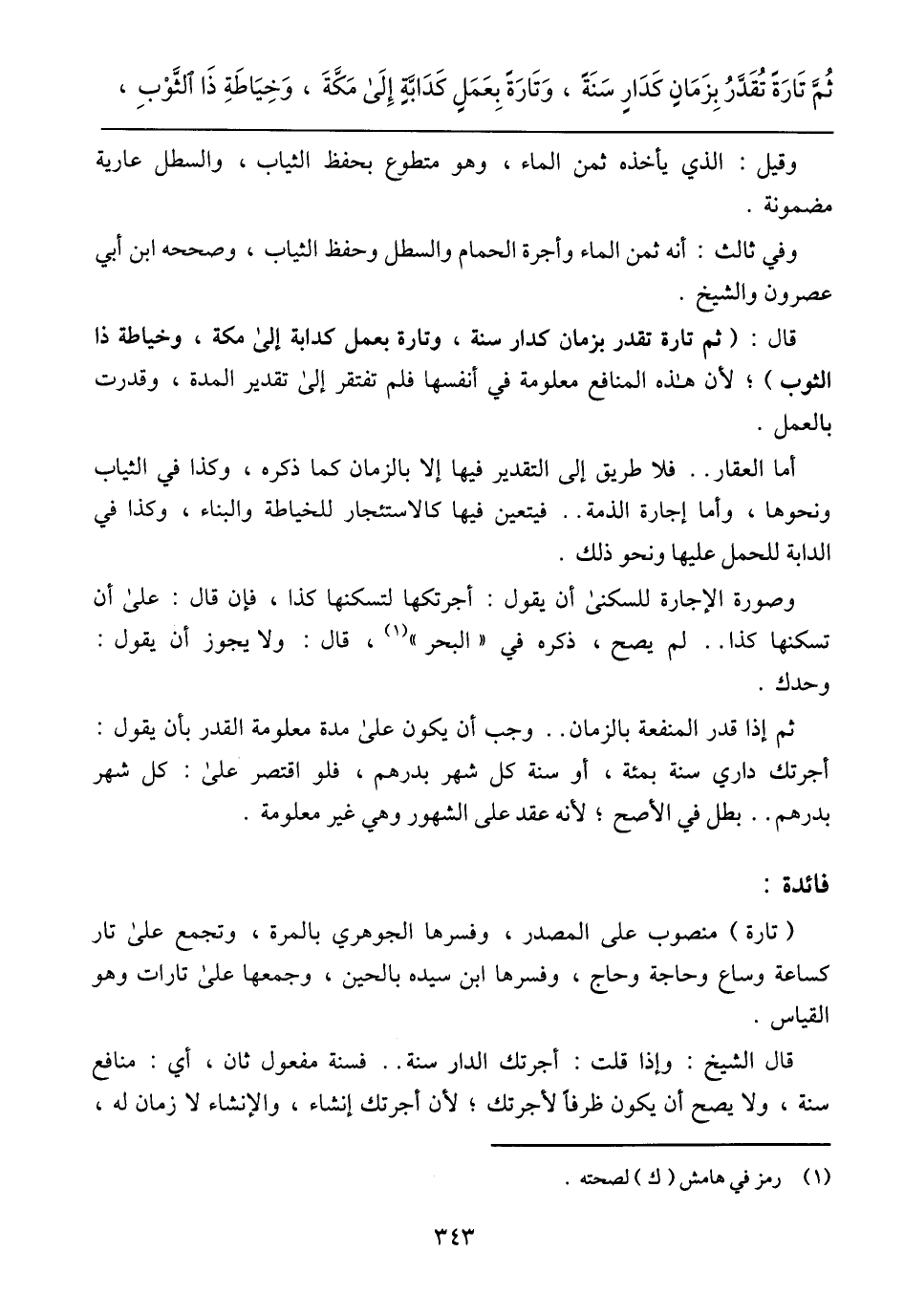 قال الشيخ: وإذا قلت: أجرتك الدار سنة .. فسنة مفعول ثان، أي: منافع سنة، ولا يصح أن يكون ظرفاً لأجرتك؛ لأن أجرتك إنشاء، والإنشاء لا زمان له،