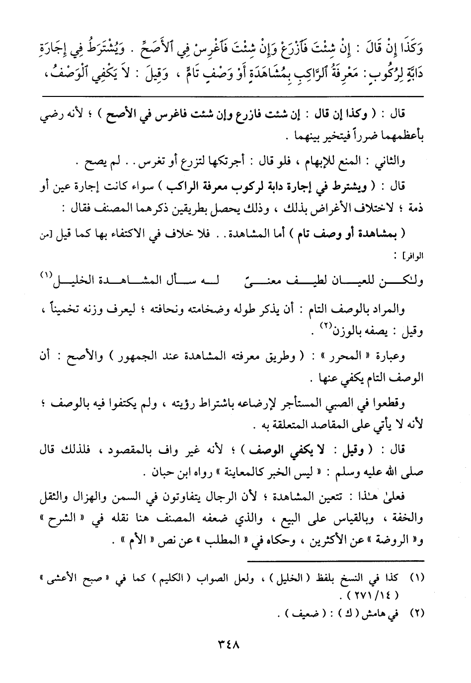 فعلى هذا: تتعين المشاهدة؛ لأن الرجال يتفاوتون في السمن والهزال والثقل والخفة، وبالقياس على البيع، والذي ضعفه المصنف هنا نقله في (الشرح) و (الروضة) عن الأكثرين، وحكاه في (المطلب) عن نص (الأم).