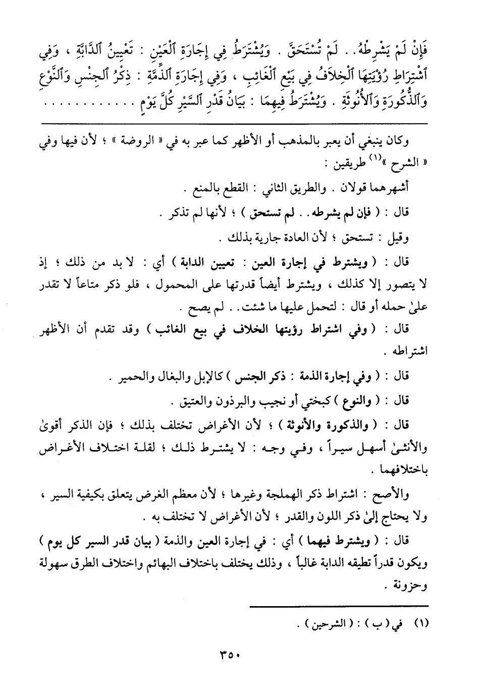 فَإِنْ لَمْ يَشْرِطْهُ .. لَمْ تُسْتَحَقَّ. وَيُشْتَرَطْ فِي إِجَارَةِ الْعَيْنِ: تَعْيِينُ الدَّابَّةِ، وَفِي اشْتِرَاطِ رُؤْيَتِهَا الْخِلاَفُ فِي بَيْع الْغَائِبِ، وَفِي إِجَارَةِ الذِّمِّةِ: ذِكْرُ الجِنْسِ وَالنَّوْعِ وَالذُّكُورَةِ وَالأُنُوثَةِ. وَيُشْتَرَطُ فِيهِمَا: بَيَانُ قَدْرِ السَّيْرِ كُلِّ يَوْمٍ