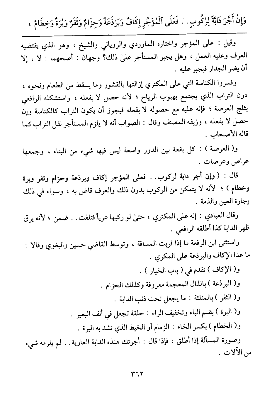 واستثنى ابن الرفعة ما إذا قربت المسافة، وتوسط القاضي حسين والبغوي وقالا: ما عدا الإكاف والبرذعة على المكري.