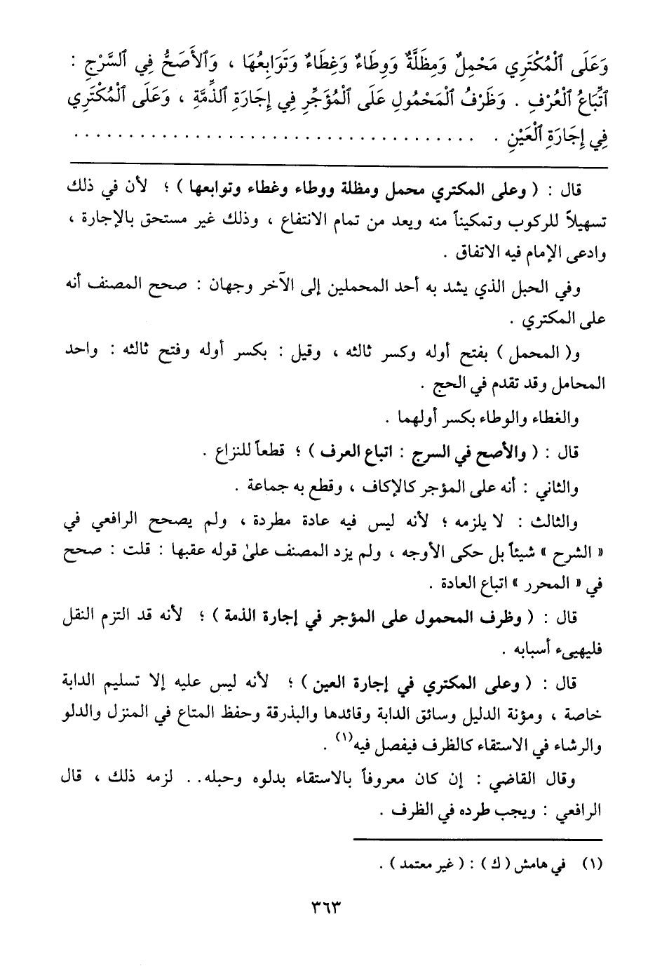 وَعَلَى الْمُكْتَرِي مَحْمِلٌ وَمِظَلَّةٌ وَوِطَاءٌ وَغِطَاءٌ وَتَوَابِعُهَا، وَالأَصَحُّ فِي السِّرْجِ: إتِّبَاعُ الْعُرْفِ. وَظَرْفُ الْمَحْمُولِ عَلَى الْمُؤَجِّرِ فِي إِجَارَةِ الذِّمَّة، وَعَلَى الْمُكْتَرِي فِي إِجَارَةِ الْعَيْنِ.