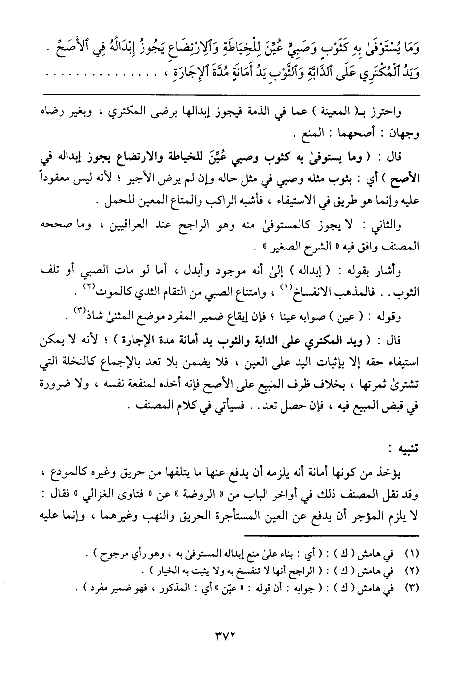 وَمَا يُسْتَوْفَى بِهِ كَثَوْبٍ وَصَبِيٍّ عُيِّنَ لِلْخِيَاطَةِ وَالاِرْتِضَاعِ يَجْوزُ إِبْدَالُهُ فِي الأصَحِّ وَيَدُ الْمُكْتَرِي عَلَى الدَّابَّةِ وَالثَّوْبِ يَدُ أَمَانَةٍ مُدَّةَ الإجَارَةِ،