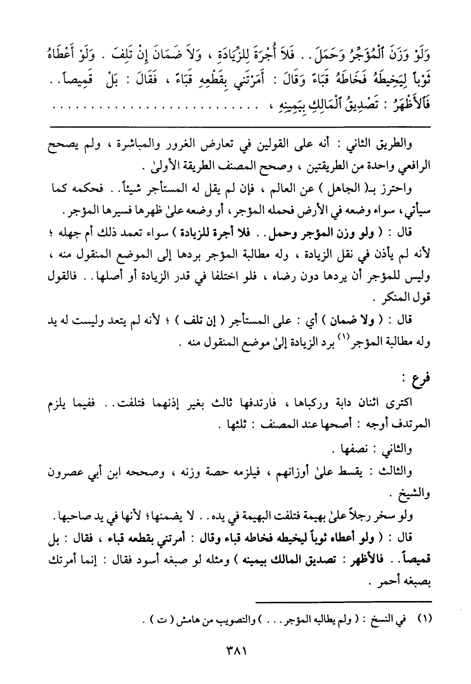 وَلَوْ وَزَنَ الْمُؤَجِّرُ وَحَمَلَ .. فَلاَ أُجْرَةَ لِلزِّيَادَةِ، وَلاَ ضَمَانَ إِنْ تَلِفَ. وَلَوْ أَعْطَاهُ ثَوْبًا لِيَخِيطَهُ فَخَاطَهُ قَبَاءً وَقَالَ: أَمَرْتَني بِقَطْعِهِ قَبَاءً، فَقَالَ: بَلْ قَمِيصًا .. فَالأَظْهَرُ: تَصْدِيقُ الْمَالِكِ بِيَمِينِهِ،