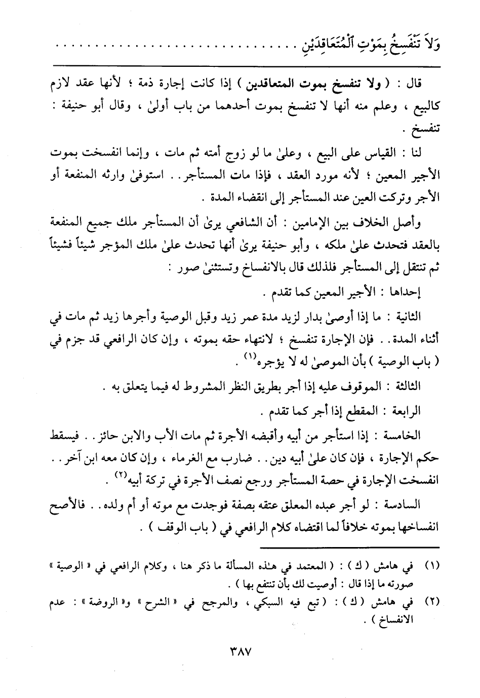 قال: (ولا تنفسخ بموت المتعاقدين) إذا كانت إجارة ذمة؛ لأنها عقد لازم كالبيع، وعلم منه أنها لا تنفسخ بموت أحدهما من باب أولى، وقال أبو حنيفة: تنفسخ.