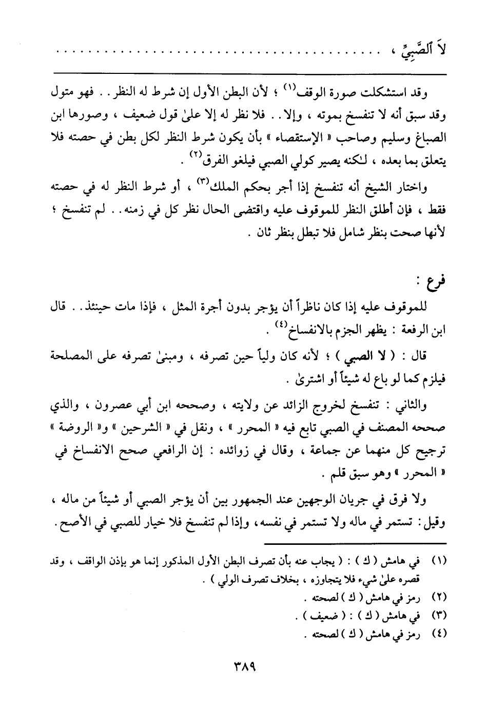 وقد استشكلت صورة الوقف؛ لأن البطن الأول إن شرط له النظر .. فهو متول وقد سبق أنه لا تنفسخ بموته، وإلا .. فلا نظر له إلا على قول ضعيف، وصورها ابن الصباغ وسليم وصاحب (الاستقصاء) بأن يكون شرط النظر لكل بطن في حصته فلا يتعلق بما بعده، لكنه يصير كولي الصبي فيلغو الفرق.