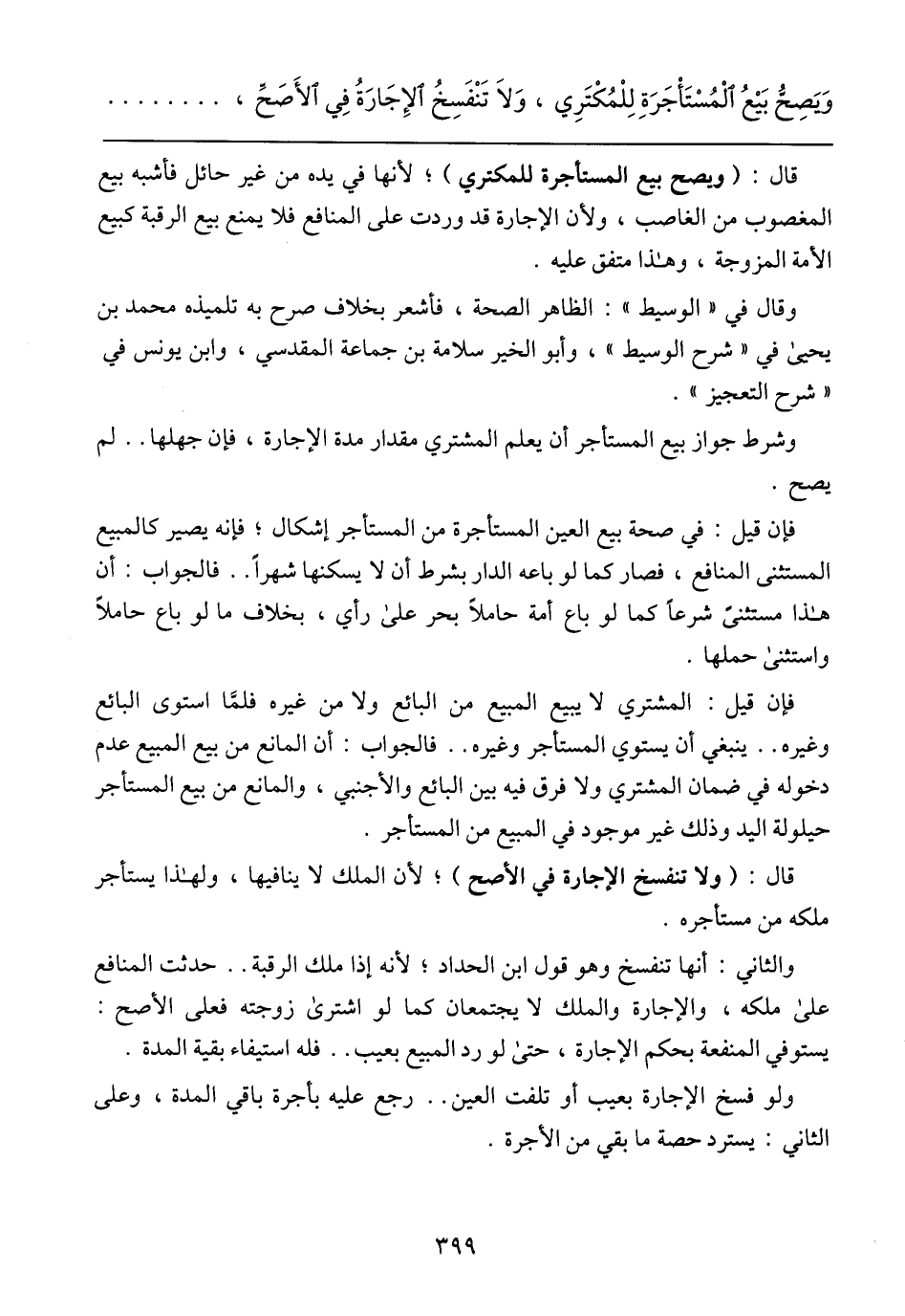 فإن قيل: في صحة بيع العين المستأجرة من المستأجر إشكال؛ فإنه يصير كالمبيع المستثنى المنافع، فصار كما لو باعه الدار بشرط أن لا يسكنها شهراً .. فالجواب: أن هذا مستثنى شرعًا كما لو باع أمة حاملا بحر على رأي، بخلاف ما لو باع حاملاً واستثنى حملها.