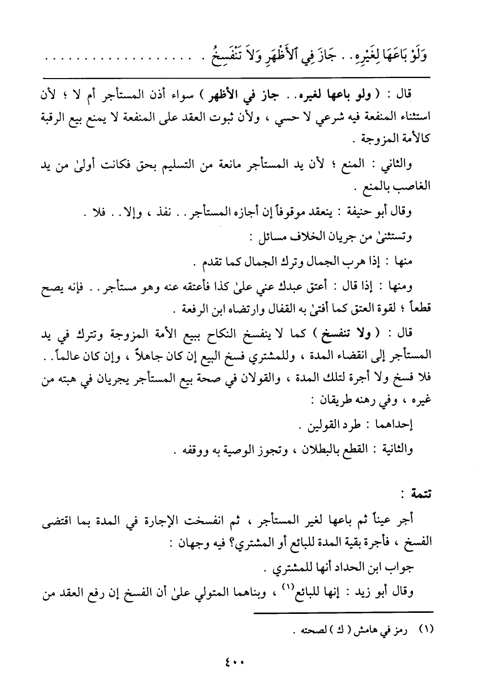 قال: (ولا تنفسخ) كما لا ينفسخ النكاح ببيع الأمة المزوجة وتترك في يد المستأجر إلى انقضاء المدة، وللمشتري فسخ البيع إن كان جاهلاً، وإن كان عالماً .. فلا فسخ ولا أجرة لتلك المدة، والقولان في صحة بيع المستأجر يجريان في هبته من غيره، وفي رهنه طريقان: