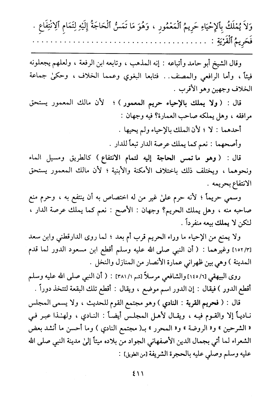 قال: (فحريم القرية: النادي) وهو مجتمع القوم للحديث، ولا يسمى المجلس ناديًا إلا والقوم فيه، ويقال لأهل المجلس أيضًا: النادي، ولهذا عبر في (الشرحين) و (الروضة) و (المحرر) بـ (مجتمع النادي) وما أحسن ما أنشد بعض الشعراء لما أتى بجمال الدين الأصفهاني الجواد من بلاده ميتًا إلى مدينة النبي صلى الله عليه وسلم وصلى عليه بالحجرة الشريفة [من الطويل]:
