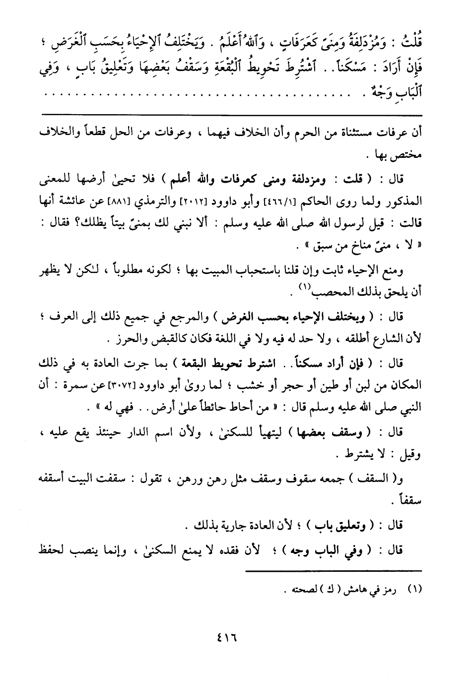 قُلْتُ: وَمُزْدَلِفَةُ وَمِنَىً كَعَرَفَاٍ، وَالله أَعْلَمُ. وَيَخْتَلِفُ الإِحْيَاءُ بِحَسَبِ الْغَرَضِ؛ فَإِنْ أَرَادَ: مَسْكَناً .. اشْتُرِطَ تَحْوِيطُ الْبُقْعَةِ وَسَقْفُ بَعْضِهَا وَتَعْلِيقُ بَابٍ، وَفِي الْبَابِ وَجْهٌ.