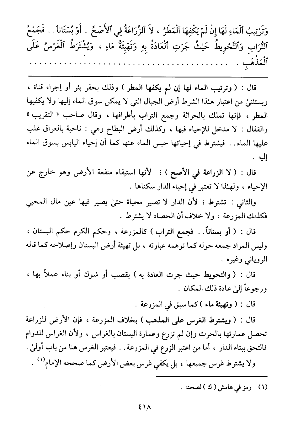قال: (وترتيب الماء لها إن لم يكفها المطر) وذلك بحفر بئر أو إجراء قناة، ويستثنى من اعتبار هذا الشرط أرض الجبال التي لا يمكن سوق الماء إليه ولا يكفيها المطر، فإنها تملك بالحراثة وجمع التراب بأطرافها، وقال صاحب (التقريب) والقفال: لا مدخل للإحياء فيها، وكذلك أرض البطاح وهي: ناحية بالعراق غلب عليها الماء .. فيشترط في إحيائها حبس الماء عنها كما أن إحياء اليابس بسوق الماء إليه.