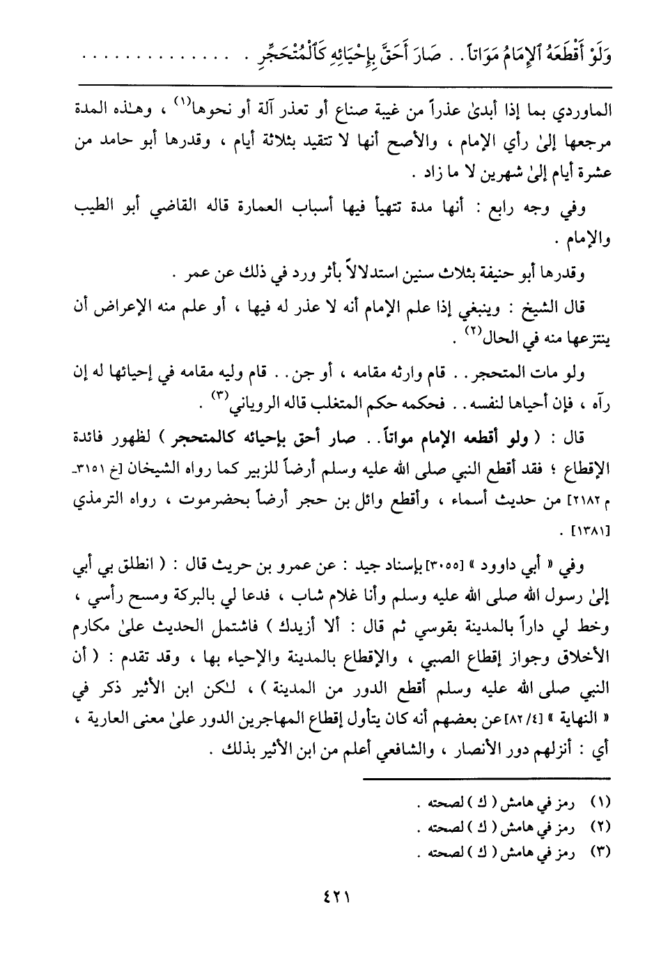 وفي (أبي داوود) [3055] بإسناد جيد: عن عمرو بن حريث قال: (انطلق بي أبي إلى رسول الله صلى الله عليه وسلم وأنا غلام شاب، فدعا لي بالبركة ومسح رأسي، وخط لي دارًا بالمدينة بقوسي ثم قال: ألا أزيدك) فاشتمل الحديث على مكارم الأخلاق وجواز إقطاع الصبي، والإقطاع بالمدينة والإحياء بها، وقد تقدم: (أن النبي صلى الله عليه وسلم أقطع الدور من المدينة)، لكن ابن الأثير ذكر في (النهاية) [4/ 82] عن بعضهم أنه كان يتأول إقطاع المهاجرين الدور على معنى العارية، أي: أنزلهم دور الأنصار، والشافعي أعلم من ابن الأثير بذلك.