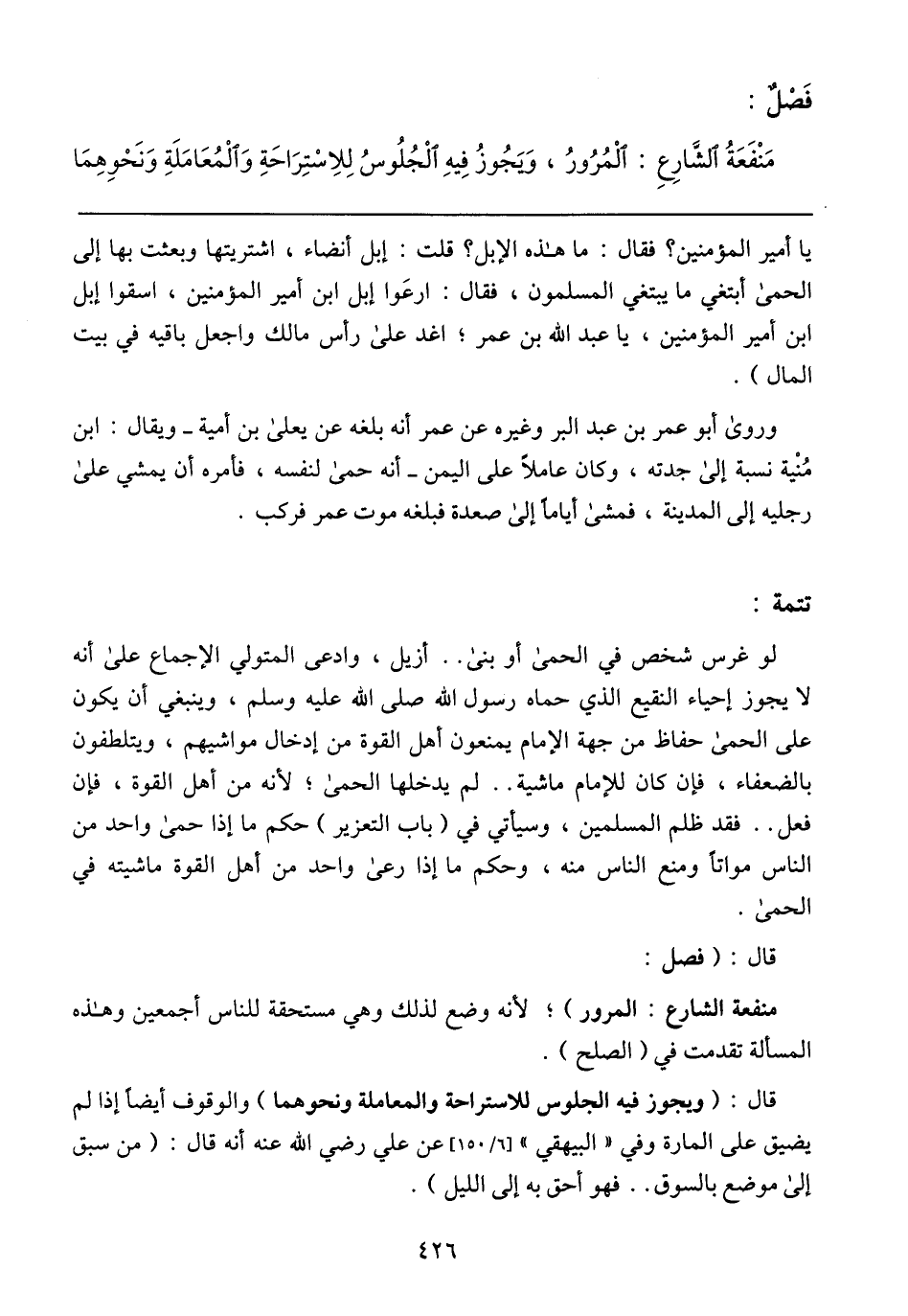 وروى أبو عمر بن عبد البر وغيره عن عمر أنه بلغه عن يعلى بن أمية- ويقال: ابن منية نسبة إلى جدته، وكان عاملاً على اليمن- أنه حمى لنفسه، فأمره أن يمشي على رجليه إلى المدينة، فمشى أياماً إلى صعدة فبلغه موت عمر فركب.