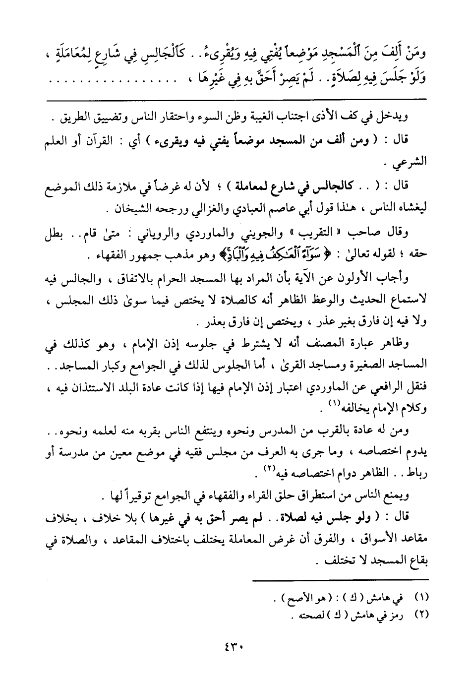 ويدخل في كف الأذى اجتناب الغيبة وظن السوء واحتقار الناس وتضييق الطريق. قال: (ومن ألف من المسجد موضعًا يفتي فيه ويقرئ) أي: القرآن أو العلم الشرعي.