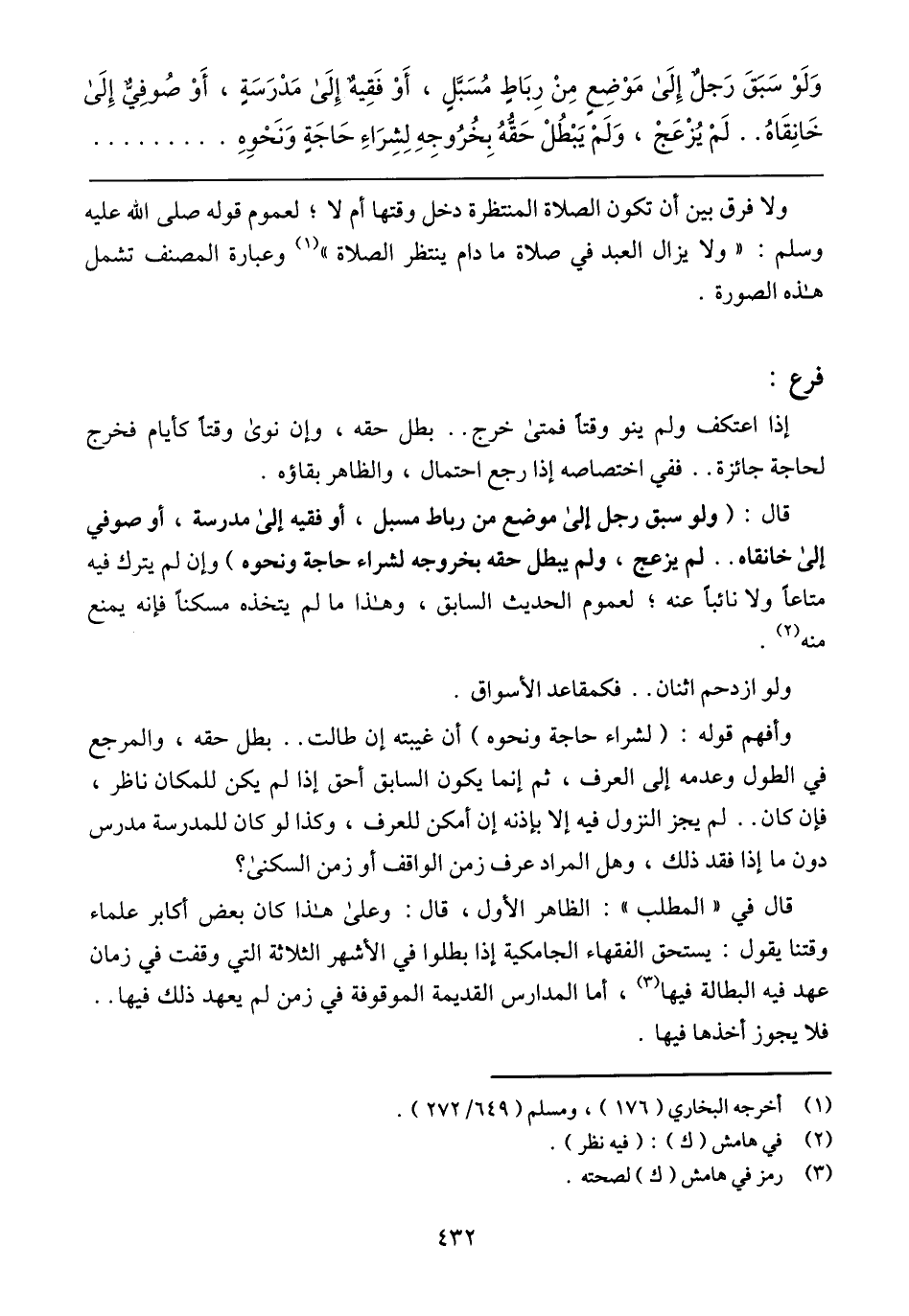 وَلَوْ سَبَقَ رَجلٌ إِلَى مَوْضِعٍ مِنْ رِبَاطٍ مُسَبَّلٍ، أَوْ فَقِيهٌ إِلَى مَدْرَسَةٍ، أَوْ صُوفِيٌّ إِلَى خَانِقَاهُ .. لَمْ يُزْعَجْ، وَلَمْ يَبْطُلْ حَقُّهُ بِخُرُوجِهِ لِشِرَاءِ حَاجَةٍ وَنَحْوِهِ.