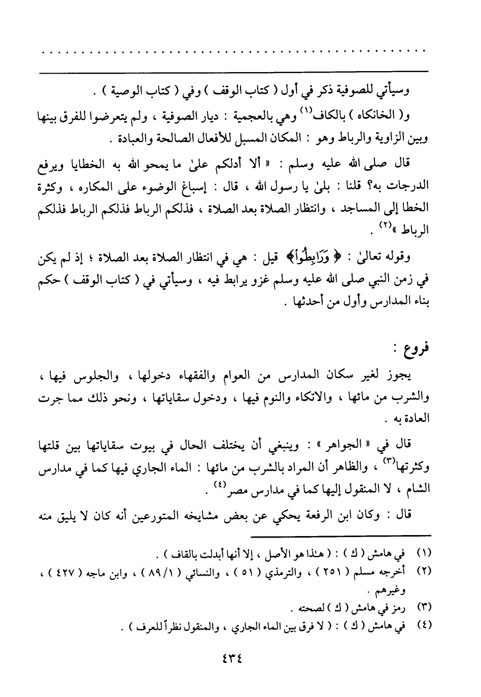 قال في (الجواهر): وينبغي أن يختلف الحال في بيوت سقاياتها بين قلتها وكثرتها، والظاهر أن المراد بالشرب من مائها: الماء الجاري فيها كما في مدارس الشام، لا المنقول إليها كما في مدارس مصر.