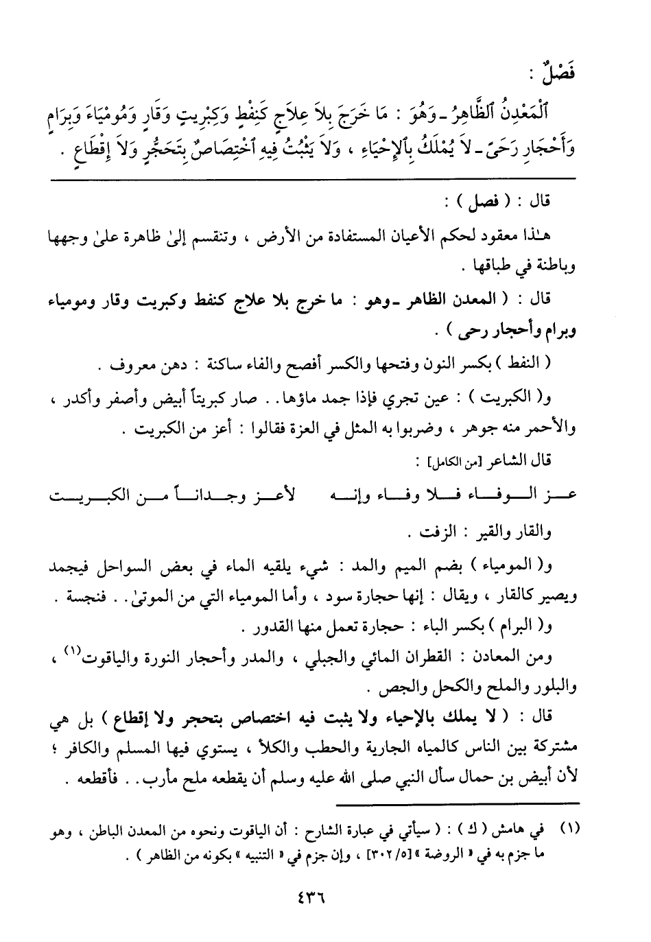 قال: (لا يملك بالإحياء ولا يثبت فيه اختصاص بتحجر ولا إقطاع) بل هي مشتركة بين الناس كالمياه الجارية والحطب والكلأ، يستوي فيها المسلم والكافر؛ لأن أبيض بن حمال سأل النبي صلى الله عليه وسلم أن يقطعه ملح مأرب .. فأقطعه.