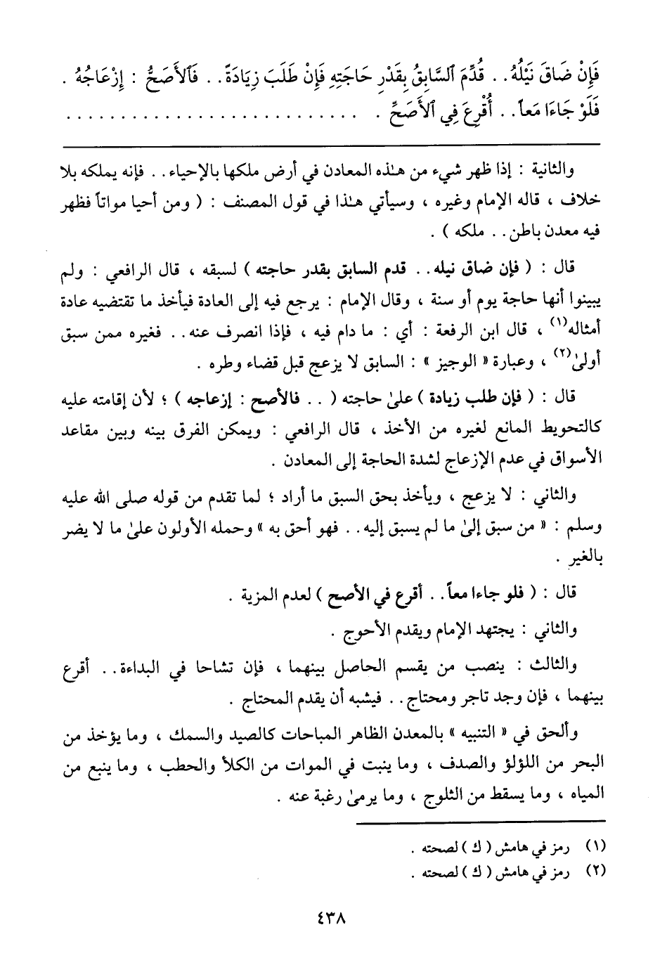 قال: (فإن ضاق نيله .. قدم السابق بقدر حاجته) لسبقه، قال الرافعي: ولم يبينوا أنها حاجة يوم أو سنة، وقال الإمام: يرجع فيه إلى العادة فيأخذ ما تقتضيه عادة أمثاله، قال ابن الرفعة: أي: ما دام فيه، فإذا انصرف عنه .. فغيره ممن سبق أولى، وعبارة (الوجيز): السابق لا يزعج قبل قضاء وطره.