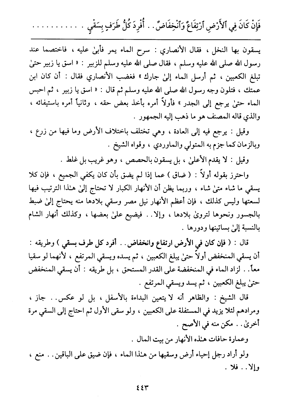يسقون بها النخل، فقال الأنصاري: سرح الماء يمر فأبى عليه، فاختصما عند رسول الله صلى الله عليه وسلم، فقال صلى الله عليه وسلم للزبير: (اسق يا زبير حتى تبلغ الكعبين، ثم أرسل لماء إلى جارك) فغضب الأنصاري فقال: أن كان ابن عمتك، فتلون وجه رسول الله صلى الله عليه وسلم ثم قال: (اسق يا زبير، ثم احبس الماء حتى يرجع إلى الجدار) فأولا أمره بأخذ بعض حقه، وثانياً أمره باستيفائه، والذي قاله المصنف هو ما ذهب إليه الجمهور.