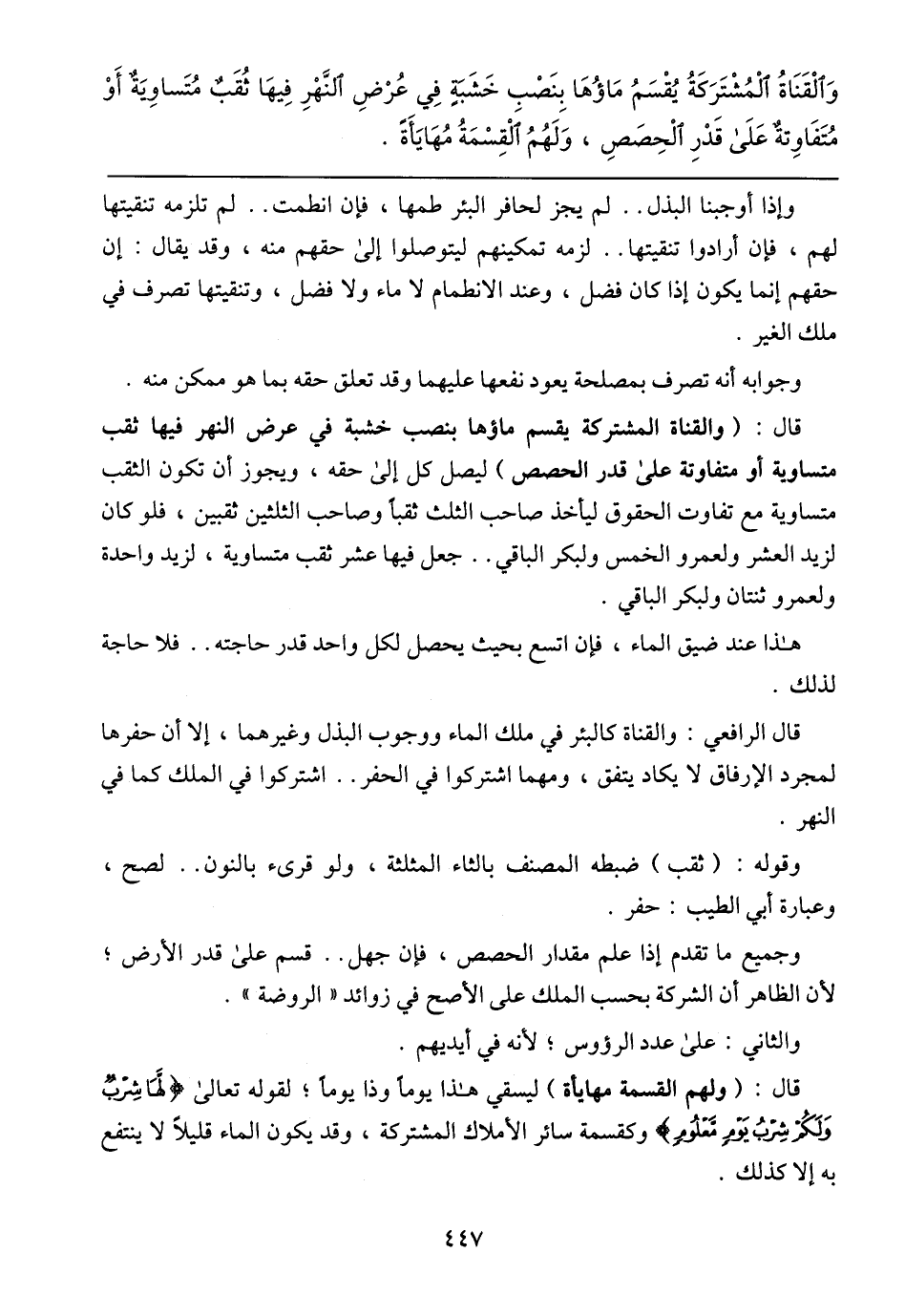 قال: (والقناة المشتركة يقسم ماؤها بنصب خشبة في عرض النهر فيها ثقب متساوية أو متفاوتة على قدر الحصص) ليصل كل إلى حقه، ويجوز أن تكون الثقب متساوية مع تفاوت الحقوق ليأخذ صاحب الثلث ثقباً وصاحب الثلثين ثقبين، فلو كان لزيد العشر ولعمرو الخمس ولبكر الباقي .. جعل فيها عشر ثقب متساوية، لزيد واحدة ولعمرو ثنتان ولبكر الباقي.