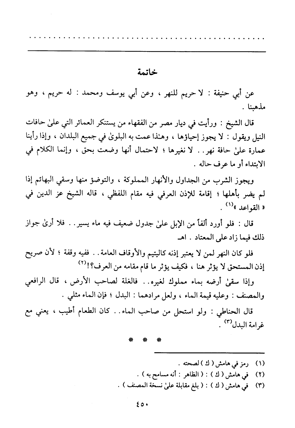 قال الشيخ: ورأيت في ديار مصر من الفقهاء من يستنكر العمائر التي على حافات النيل ويقول: لا يجوز إحياؤها، وهذا عمت به البلوى في جميع البلدان، وإذا رأينا عمارة على حافة نهر .. لا نغيرها؛ لاحتمال أنها وضعت بحق، وإنما الكلام في الابتداء أو ما عرف حاله.
