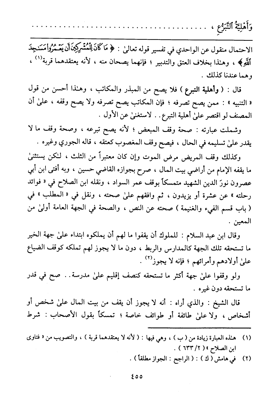وكذلك وقف المريض مرض الموت وإن كان معتبراً من الثلث، لكن يستثنى ما يقفه الإمام من أراضي بيت المال، صرح بجوازه القاضي حسين، وبه أفتى ابن أبي عصرون نور الدين الشهيد متمسكاً بوقف عمر السواد، ونقله ابن الصلاح في (فوائد رحلته) عن عشرة أو يزيدون، ثم وافقهم على صحته، ونقل في (المطلب) في (باب قسم الفيء والغنيمة) صحته عن النص، والصحة في الجهة العامة أولى من المعين.