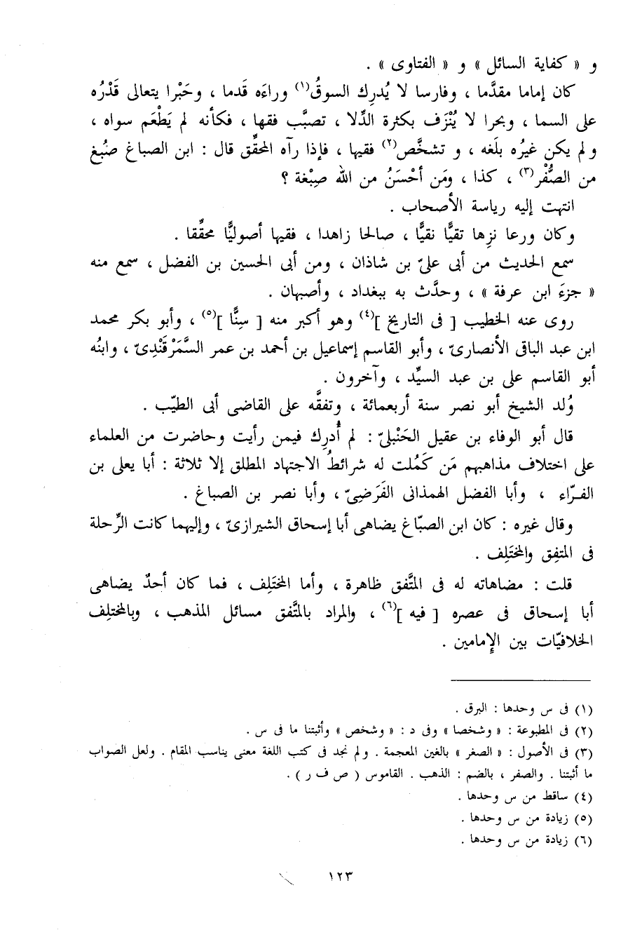 قَالَ أَبُو الْوَفَاء بن عقيل الْحَنْبَلِيّ لم أدْرك فِيمَن رَأَيْت وحاضرت من الْعلمَاء على اخْتِلَاف مذاهبهم من كملت لَهُ شَرَائِط الِاجْتِهَاد الْمُطلق إِلَّا ثَلَاثَة أَبَا يعلى بن الْفراء وَأَبا الْفضل الهمذاني الفرضي وَأَبا نصر بن الصّباغ