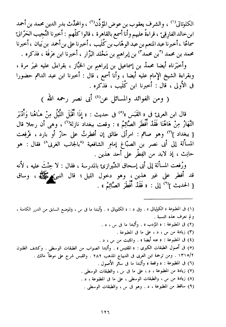 الكلوتاتي والشرف يَعْقُوب بن عوض الْمُؤَذّن والمحدث بدر الدّين مُحَمَّد بن أَحْمد ابْن خَالِد الفارقي قِرَاءَة عَلَيْهِم وَأَنا أسمع بِالْقَاهِرَةِ قَالُوا كلهم أخبرنَا النجيب الْحَرَّانِي سَمَاعا أخبرنَا عبد الْمُنعم بن عبد الْوَهَّاب بن كُلَيْب أخبرنَا عَليّ بن أَحْمد بن بَيَان أخبرنَا مُحَمَّد بن مُحَمَّد بن مُحَمَّد بن إِبْرَاهِيم بن مخلد الْبَزَّار أخبرنَا ابْن عَرَفَة فَذكره