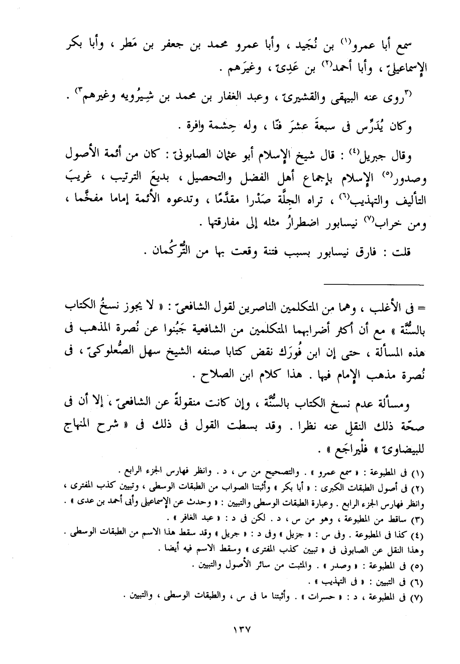 وَقَالَ جِبْرِيل قَالَ شيخ الْإِسْلَام أَبُو عُثْمَان الصَّابُونِي كَانَ من أَئِمَّة الْأُصُول وصدور الْإِسْلَام بِإِجْمَاع أهل الْفضل والتحصيل بديع التَّرْتِيب غَرِيب التَّأْلِيف والتهذيب ترَاهُ الجلة صَدرا مقدما وَتَدْعُوهُ الْأَئِمَّة إِمَامًا مفخما وَمن خراب نيسابور اضطرار مثله إِلَى مفارقتها