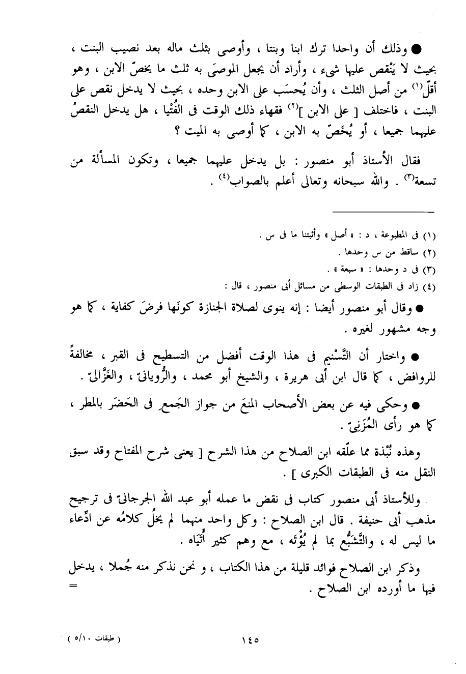 وَذَلِكَ أَن وَاحِدًا ترك ابْنا وبنتا وَأوصى بِثلث مَاله بعد نصيب الْبِنْت بِحَيْثُ لَا ينقص عَلَيْهَا شَيْء وَأَرَادَ أَن يَجْعَل الْمُوصي بِهِ ثلث مَا يخص الابْن وَهُوَ أقل من أصل الثُّلُث وَأَن يحْسب على الابْن وَحده بِحَيْثُ لَا يدْخل نقص على الْبِنْت فَاخْتلف على الابْن فُقَهَاء ذَلِك الْوَقْت فِي الْفتيا هَل يدْخل النَّقْص عَلَيْهِمَا جَمِيعًا أَو يخص بِهِ الابْن كَمَا أوصى بِهِ الْمَيِّت فَقَالَ الْأُسْتَاذ أَبُو مَنْصُور بل يدْخل عَلَيْهِمَا جَمِيعًا وَتَكون الْمَسْأَلَة من تِسْعَة