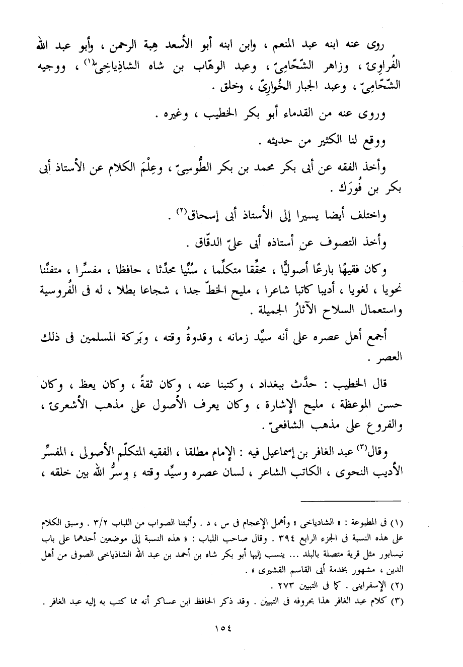 وَقَالَ عبد الغافر بن إِسْمَاعِيل فِيهِ الإِمَام مُطلقًا الْفَقِيه الْمُتَكَلّم الأصولي الْمُفَسّر الأديب النَّحْوِيّ الْكَاتِب الشَّاعِر لِسَان عصره وَسيد وقته وسر الله بَين خلقه