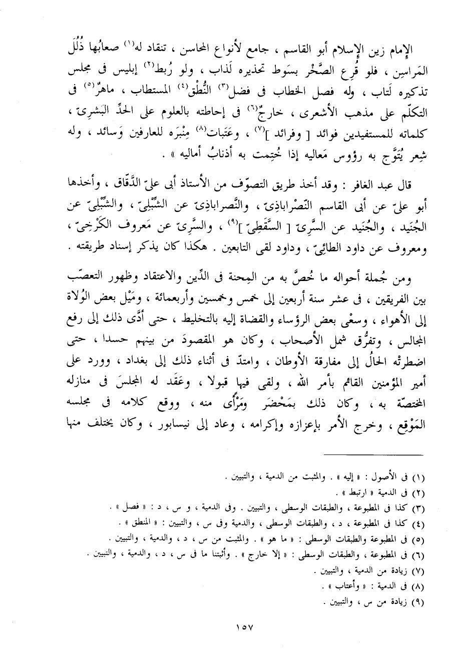 الإِمَام زين الْإِسْلَام أَبُو الْقَاسِم جَامع لأنواع المحاسن تنقاد لَهُ صعابها ذلل المراسن فَلَو قرع الصخر بِسَوْط تحذيره لذاب وَلَو ربط إِبْلِيس فِي مجْلِس تذكيره لتاب وَله فصل الْخطاب فِي فضل النُّطْق المستطاب ماهر فِي التَّكَلُّم على مَذْهَب الْأَشْعَرِيّ خَارج فِي إحاطته بالعلوم على الْحَد البشري كَلِمَاته للمستفيدين فَوَائِد وفرائد وعتبات منبره للعارفين وسائد وَله شعر يتوج بِهِ رُؤُوس معاليه إِذا ختمت بِهِ أَذْنَاب أَمَالِيهِ