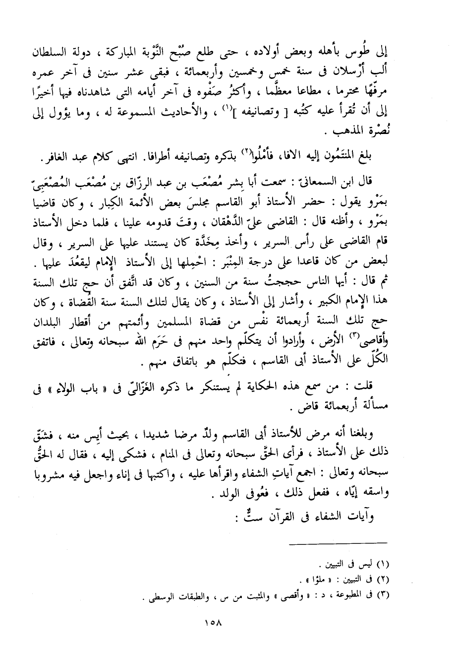 إِلَى طوس بأَهْله وَبَعض أَوْلَاده حَتَّى طلع صبح النّوبَة الْمُبَارَكَة دولة السُّلْطَان ألب أرسلان فِي سنة خمس وَخمسين وَأَرْبَعمِائَة فَبَقيَ عشر سِنِين فِي آخر عمره مرفها مُحْتَرما مُطَاعًا مُعظما وَأكْثر صَفوه فِي آخر أَيَّامه الَّتِي شَاهَدْنَاهُ فِيهَا أخيرا إِلَى أَن تقْرَأ عَلَيْهِ كتبه وتصانيفه وَالْأَحَادِيث المسموعة لَهُ وَمَا يؤول إِلَى نصْرَة الْمَذْهَب