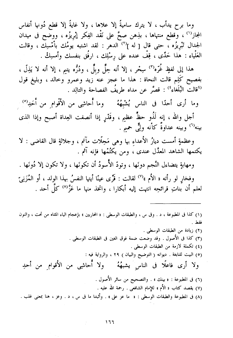 هَذَا إِلَى لفظ غرَّة سحر إِلَّا أَنه حل وبل ودره يَتِيم إِلَّا أَنه لَا يذل بفصيح كلم قَالَت النُّحَاة هَذَا مَا عجز عَنهُ زيد وَعَمْرو وخَالِد وبليغ قَول قَالَت البلغاء قصر عَن مداه طريف الفصاحة والتالد