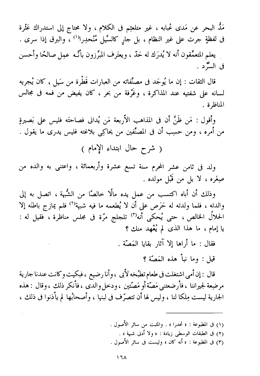 قيل وَمَا نبأ هَذِه المصة قَالَ إِن أُمِّي اشتغلت فِي طَعَام تطبخه لأبي وَأَنا رَضِيع فَبَكَيْت وَكَانَت عندنَا جَارِيَة مُرْضِعَة لجيراننا فأرضعتني مصة أَو مصتين وَدخل وَالِدي فَأنْكر ذَلِك وَقَالَ هَذِه الْجَارِيَة لَيست ملكا لنا وَلَيْسَ لَهَا أَن تتصرف فِي لَبنهَا وأصحابها لم يأذنوا فِي ذَلِك