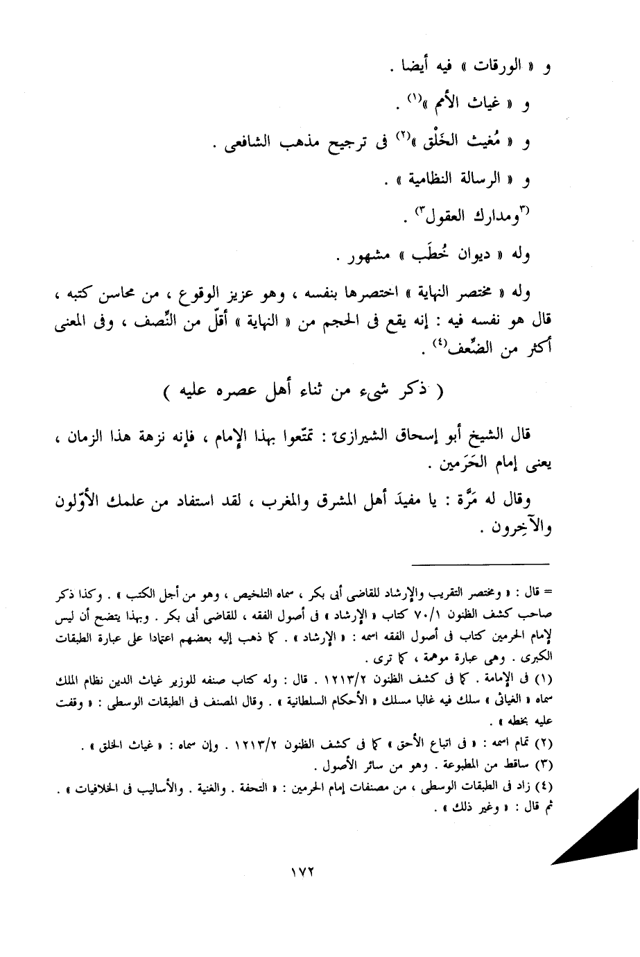 قَالَ الشَّيْخ أَبُو إِسْحَاق الشِّيرَازِيّ تمَتَّعُوا بِهَذَا الإِمَام فَإِنَّهُ نزهة هَذَا الزَّمَان يَعْنِي إِمَام الْحَرَمَيْنِ