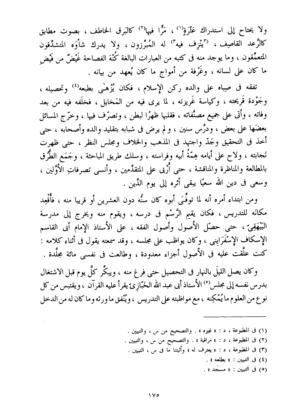 وَلَا يحْتَاج إِلَى اسْتِدْرَاك عَثْرَة مرا فِيهَا كالبرق الخاطف بِصَوْت مُطَابق كالرعد القاصف ينزف فِيهِ لَهُ المبرزون وَلَا يدْرك شأوه المتشدقون المتعمقون وَمَا يُوجد مِنْهُ فِي كتبه من الْعبارَات الْبَالِغَة كنه الفصاحة غيض من فيض مَا كَانَ على لِسَانه وغرفة من أمواج مَا كَانَ يعْهَد من بَيَانه