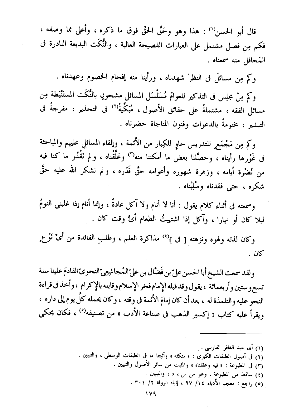 قَالَ أَبُو الْحسن هَذَا وَهُوَ وَحقّ الْحق فَوق مَا ذكره وَأَعْلَى مِمَّا وَصفه فكم من فصل مُشْتَمل على الْعبارَات الفصيحة الْعَالِيَة والنكت البديعة النادرة فِي المحافل مِنْهُ سمعناه