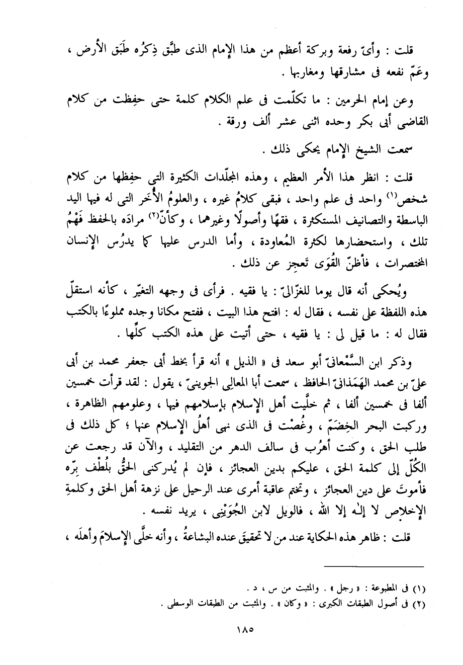 قلت انْظُر هَذَا الْأَمر الْعَظِيم وَهَذِه المجلدات الْكَثِيرَة الَّتِي حفظهَا من كَلَام شخص وَاحِد فِي علم وَاحِد فبقى كَلَام غَيره والعلوم الْأُخَر الَّتِي لَهُ فِيهَا الْيَد الباسطة والتصانيف المستكثرة فقها وأصولا وَغَيرهمَا وَكَأن مُرَاده بِالْحِفْظِ فهم تِلْكَ واستحضارها لِكَثْرَة المعاودة وَأما الدَّرْس عَلَيْهَا كَمَا يدرس الْإِنْسَان المختصرات فأظن القوى تعجز عَن ذَلِك