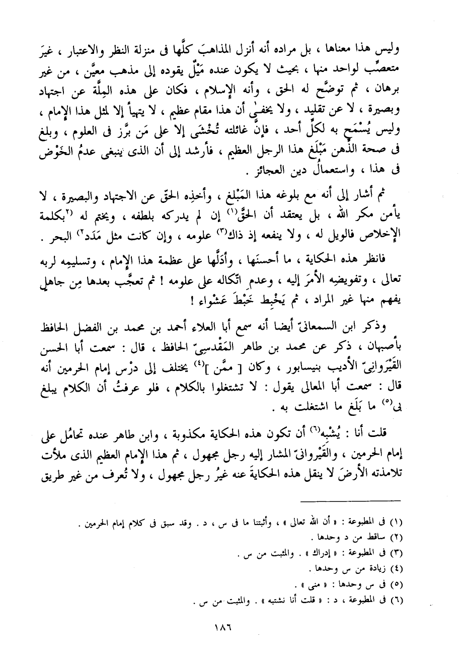 قلت أَنا يشبه أَن تكون هَذِه الْحِكَايَة مكذوبة وَابْن طَاهِر عِنْده تحامل على إِمَام الْحَرَمَيْنِ والقيرواني الْمشَار إِلَيْهِ رجل مَجْهُول ثمَّ هَذَا الإِمَام الْعَظِيم الَّذِي مَلَأت تلامذته الأَرْض لَا ينْقل هَذِه الْحِكَايَة عَنهُ غير رجل مَجْهُول وَلَا تعرف من غير طَرِيق
