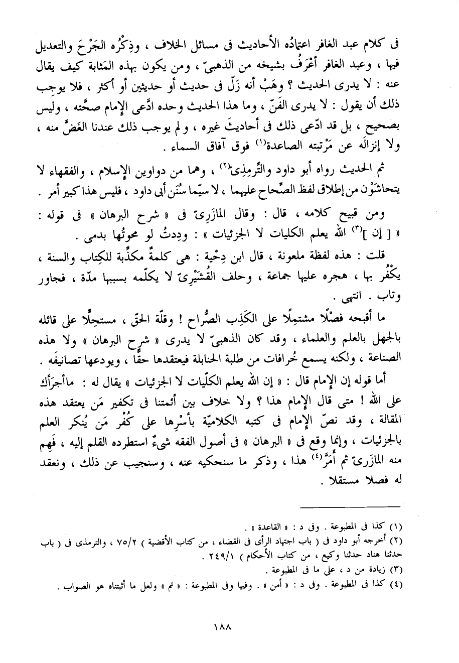 أما قَوْله إِن الإِمَام قَالَ إِن الله يعلم الكليات لَا الجزئيات يُقَال لَهُ مَا أجرأك على الله مَتى قَالَ الإِمَام هَذَا وَلَا خلاف بَين أَئِمَّتنَا فِي تَكْفِير من يعْتَقد هَذِه الْمقَالة وَقد نَص الإِمَام فِي كتبه الكلامية بأسرها على كفر من يُنكر الْعلم بالجزئيات وَإِنَّمَا وَقع فِي الْبُرْهَان فِي أصُول الْفِقْه شَيْء استطرده الْقَلَم إِلَيْهِ فهم مِنْهُ الْمَازرِيّ ثمَّ أَمر هَذَا وَذكر مَا سنحكيه عَنهُ وسنجيب عَن ذَلِك ونعقد لَهُ فصلا مُسْتقِلّا