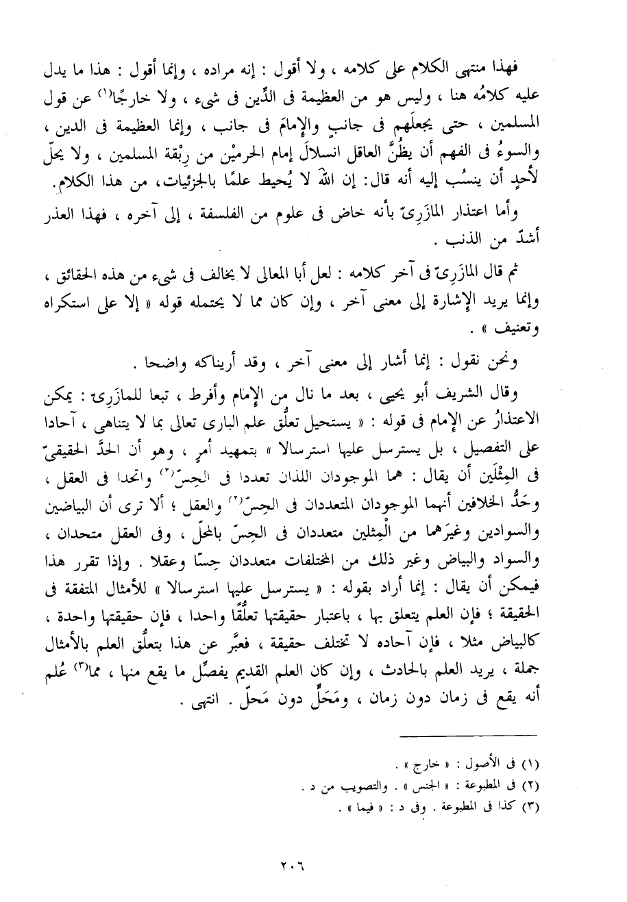 فَهَذَا مُنْتَهى الْكَلَام على كَلَامه وَلَا أَقُول إِنَّه مُرَاده وَإِنَّمَا أَقُول هَذَا مَا يدل عَلَيْهِ كَلَامه هُنَا وَلَيْسَ هُوَ من الْعَظِيمَة فِي الدّين فِي شَيْء وَلَا خَارِجا عَن قَول الْمُسلمين حَتَّى يجعلهم فِي جَانب وَالْإِمَام فِي جَانب وَإِنَّمَا الْعَظِيمَة فِي الدّين وَالسوء فِي الْفَهم أَن يظنّ الْعَاقِل انسلال إِمَام الْحَرَمَيْنِ من ربقة الْمُسلمين وَلَا يحل لأحد أَن ينْسب إِلَيْهِ أَنه قَالَ إِن الله لَا يُحِيط علما بالجزئيات من هَذَا الْكَلَام