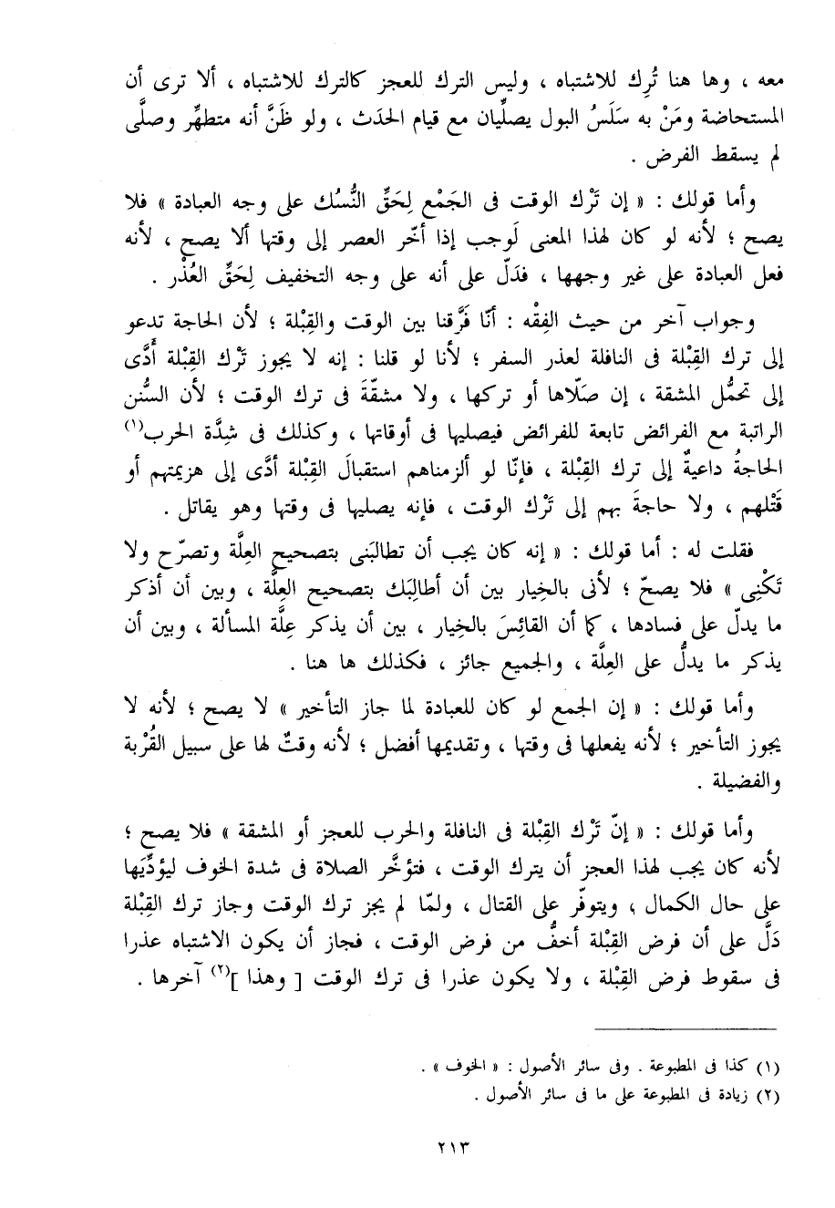وَأما قَوْلك إِن ترك الْقبْلَة فِي النَّافِلَة وَالْحَرب للعجز أَو الْمَشَقَّة فَلَا يَصح لِأَنَّهُ كَانَ يجب لهَذَا الْعَجز أَن يتْرك الْوَقْت فتؤخر الصَّلَاة فِي شدَّة الْخَوْف ليؤديها على حَال الْكَمَال ويتوفر على الْقِتَال وَلما لم يجز ترك الْوَقْت وَجَاز ترك الْقبْلَة دلّ على أَن فرض الْقبْلَة أخف من فرض الْوَقْت فَجَاز أَن يكون الِاشْتِبَاه عذرا فِي سُقُوط فرض الْقبْلَة وَلَا يكون عذرا فِي ترك الْوَقْت وَهَذَا آخرهَا