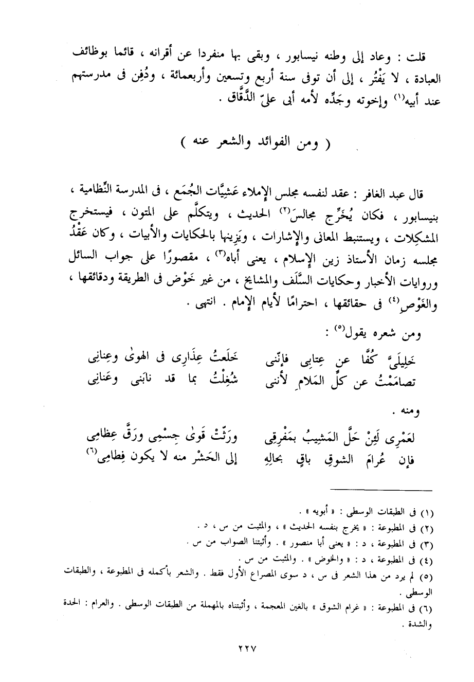 قلت وَعَاد إِلَى وَطنه نيسابور وَبَقِي بهَا مُنْفَردا عَن أقرانه قَائِما بوظائف الْعِبَادَة لَا يفتر إِلَى أَن توفّي سنة أَربع وَتِسْعين وَأَرْبَعمِائَة وَدفن فِي مدرستهم عَن أَبِيه وَإِخْوَته وجده لأمه أبي عَليّ الدقاق