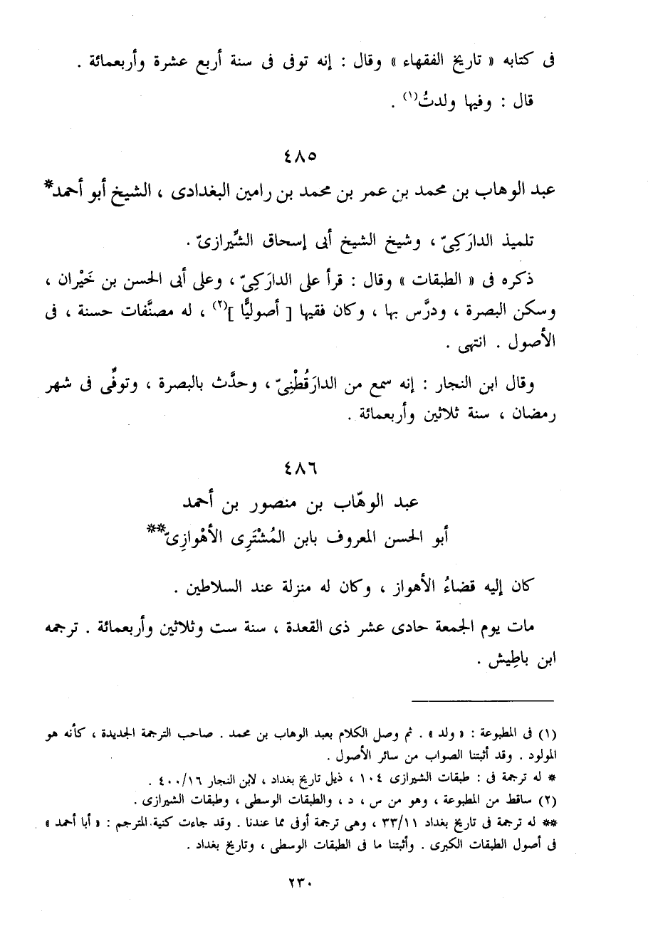 486 - عبد الْوَهَّاب بن مَنْصُور بن أَحْمد أَبُو الْحسن الْمَعْرُوف بِابْن المُشْتَرِي الْأَهْوَازِي كَانَ إِلَيْهِ قَضَاء الأهواز وَكَانَ لَهُ منزلَة عِنْد السلاطين