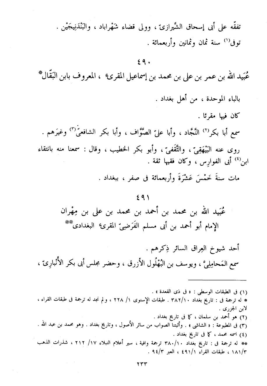 490 - عبيد الله بن عمر بن عَليّ بن مُحَمَّد بن إِسْمَاعِيل المقرىء الْمَعْرُوف بِابْن الْبَقَّال