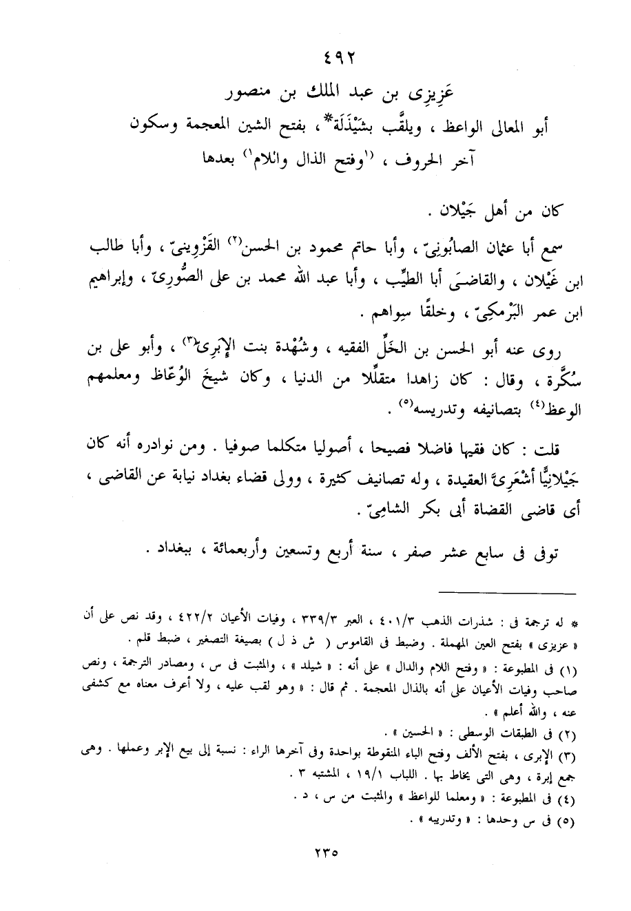 492 - عزيزي بن عبد الْملك بن مَنْصُور أَبُو الْمَعَالِي الْوَاعِظ ويلقب بشيذلة بِفَتْح الشين الْمُعْجَمَة وَسُكُون آخر الْحُرُوف وَفتح الذَّال وَاللَّام بعْدهَا