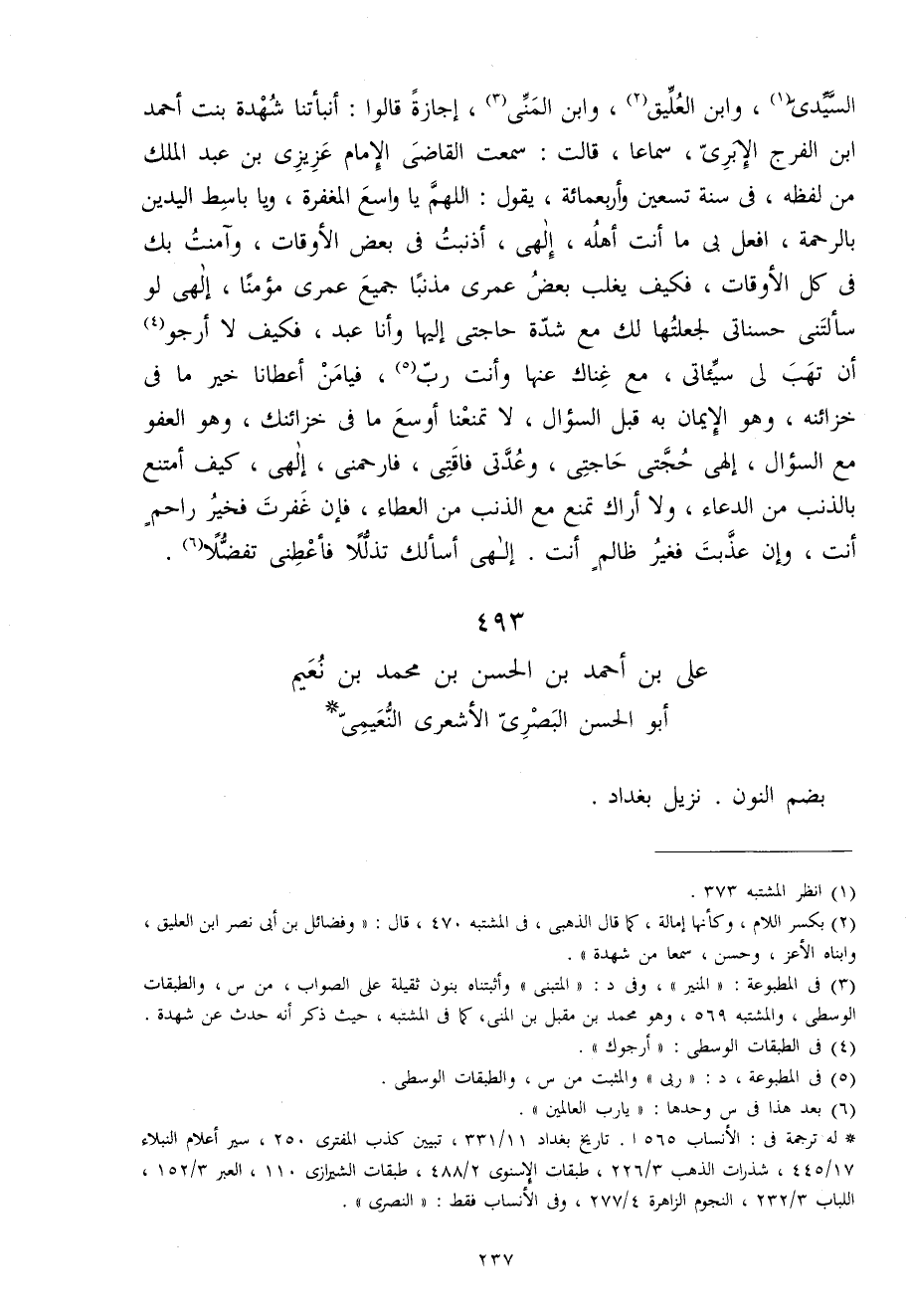 493 - عَليّ بن أَحْمد بن الْحسن بن مُحَمَّد بن نعيم أَبُو الْحسن الْبَصْرِيّ الْأَشْعَرِيّ النعيمي