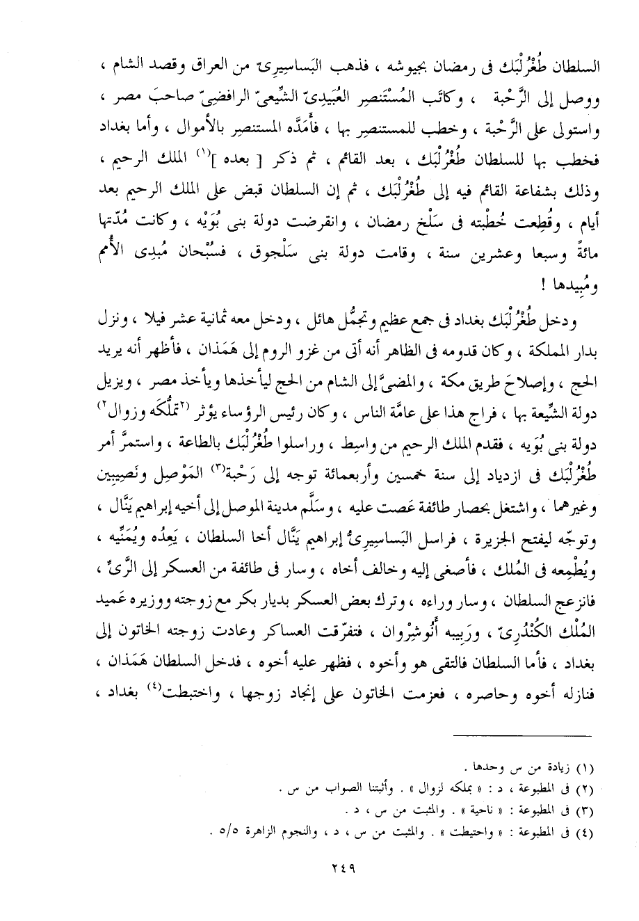 وَدخل طغرلبك بَغْدَاد فِي جمع عَظِيم وتجمل هائل وَدخل مَعَه ثَمَانِيَة عشر فيلا وَنزل بدار المملكة وَكَانَ قدومه فِي الظَّاهِر أَنه أَتَى من غَزْو الرّوم إِلَى همذان فأظهر أَنه يُرِيد الْحَج وَإِصْلَاح طَرِيق مَكَّة والمضي إِلَى الشَّام من الْحَج ليأخذها وَيَأْخُذ مصر ويزيل دولة الشِّيعَة بهَا فراج هَذَا على عَامَّة النَّاس وَكَانَ رَئِيس الرؤساء يُؤثر تملكه وَزَوَال دولة بني بويه فَقدم الْملك الرَّحِيم من وَاسِط وراسلوا طغرلبك بِالطَّاعَةِ وَاسْتمرّ أَمر طغرلبك فِي ازدياد إِلَى سنة خمسين وَأَرْبَعمِائَة توجه إِلَى رحبة الْموصل ونصيبين وَغَيرهمَا واشتغل بحصار طَائِفَة عَصَتْ عَلَيْهِ وَسلم مَدِينَة الْموصل إِلَى أَخِيه إِبْرَاهِيم ينَال وَتوجه ليفتح الجزيرة فراسل البساسيري إِبْرَاهِيم ينَال أَخا السُّلْطَان يعده ويمنيه ويطمعه فِي الْملك فأصغى إِلَيْهِ وَخَالف أَخَاهُ وَسَار فِي طَائِفَة من الْعَسْكَر إِلَى الرّيّ فانزعج السُّلْطَان وَسَار وَرَاءه وَترك بعض الْعَسْكَر بديار بكر مَعَ زَوجته ووزيره عميد الْملك الكندري وربيبه أنوشروان فتفرقت العساكر وعادت زَوجته الخاتون إِلَى بَغْدَاد فَأَما السُّلْطَان فَالتقى هُوَ وَأَخُوهُ فَظهر عَلَيْهِ أَخُوهُ فَدخل السُّلْطَان همذان فنازله أَخُوهُ وحاصره فعزمت الخاتون على إنجاد زَوجهَا واختبطت بَغْدَاد