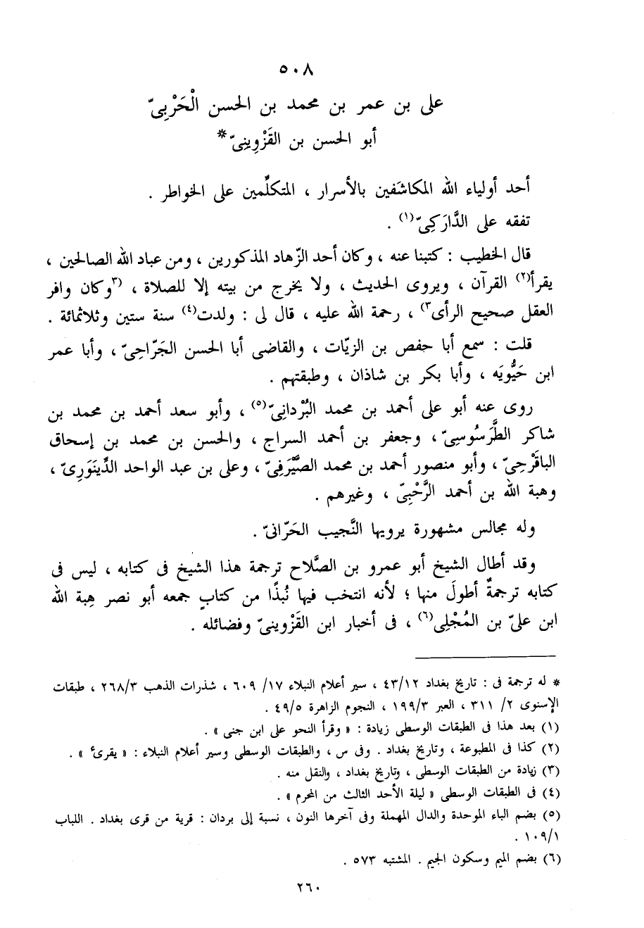 508 - عَليّ بن عمر بن مُحَمَّد بن الْحسن الْحَرْبِيّ أَبُو الْحسن بن الْقزْوِينِي