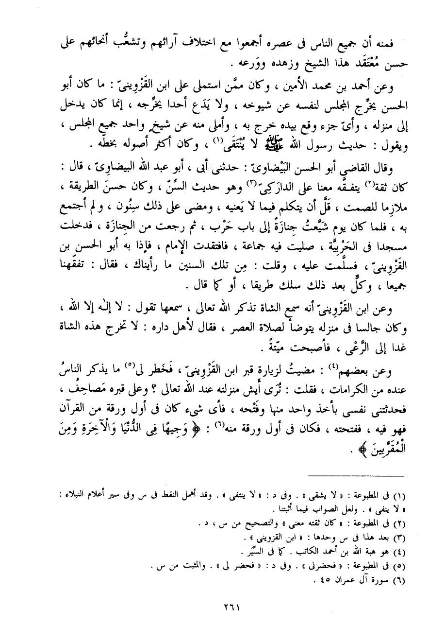 وَعَن بَعضهم مضيت لزيارة قبر ابْن الْقزْوِينِي فخطر لي مَا يذكر النَّاس عِنْده من الكرامات فَقلت ترى أيش مَنْزِلَته عِنْد الله تَعَالَى وعَلى قَبره مصاحف فحدثتني نَفسِي بِأخذ وَاحِد مِنْهَا وفتحه فَأَي شَيْء كَانَ فِي أول ورقة من الْقُرْآن فَهُوَ فِيهِ ففتحته فَكَانَ فِي أول ورقة مِنْهُ {وجيها فِي الدُّنْيَا وَالْآخِرَة وَمن المقربين}